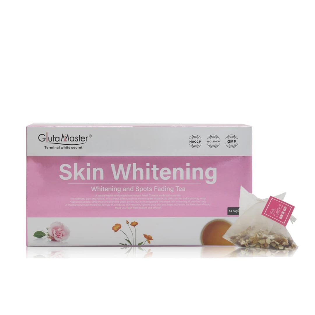 The Gluta Master Skin Whitening and Spots Fading Tea is a herbal beverage designed to enhance skin radiance and address various skin concerns. Each box contains 30 tea bags, each weighing 3 grams, totaling 90 grams per box. The tea is formulated with natural Chinese medicinal ingredients, free from additives, aiming to improve skin health from within.