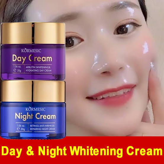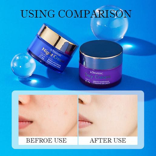 The KORMESIC 2-Piece Day & Night Cream Set is a skincare regimen designed to enhance skin brightness, even out skin tone, reduce dark spots and blemishes, and provide anti-aging benefits. This set includes two creams formulated for use during the day and night, each tailored to address the skin’s specific needs at different times.