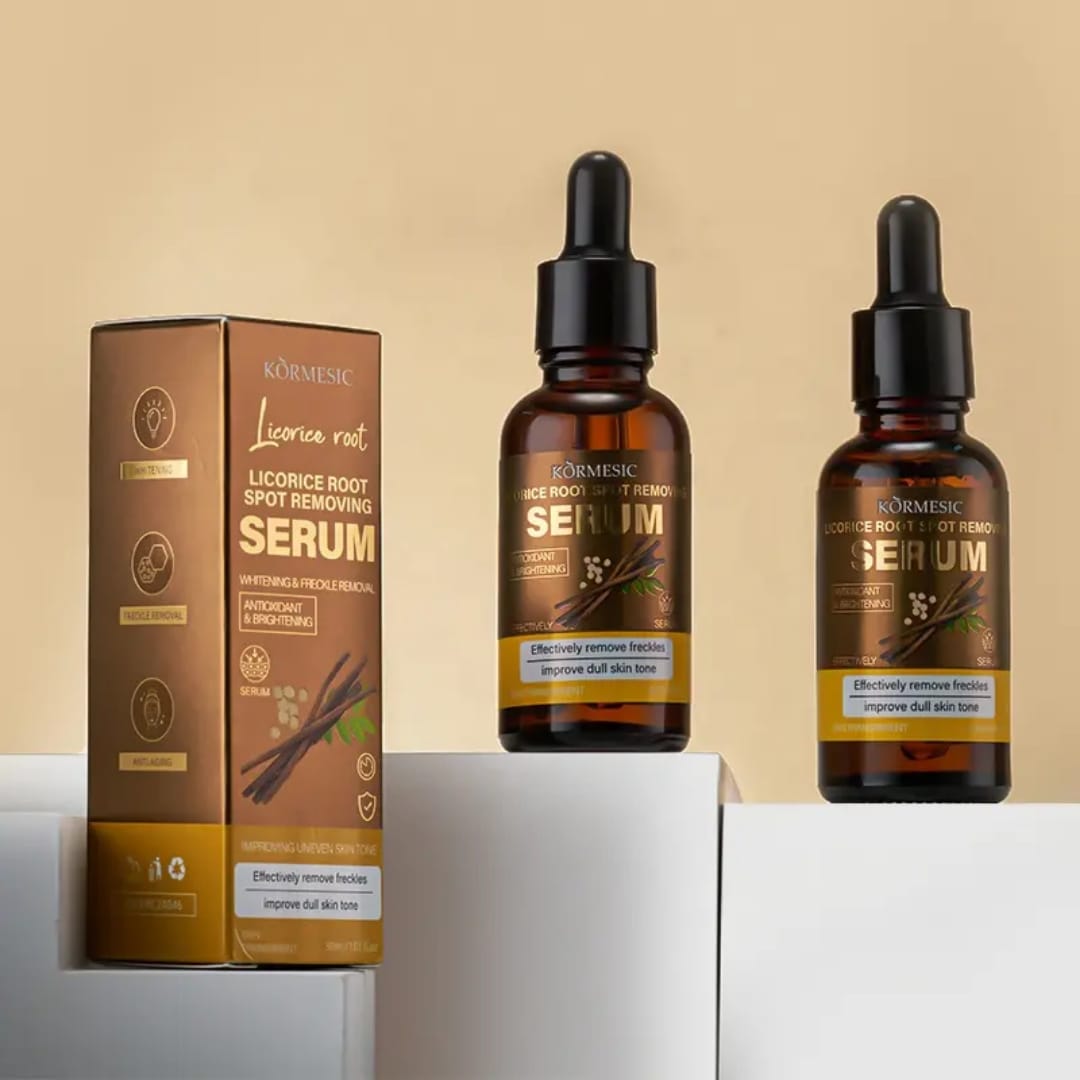 KORMESIC’s Licorice Root Spot Removing Serum is an anti-spot facial serum formulated to target hyperpigmentation and promote a more even skin tone. Licorice extract, the primary active ingredient, is renowned for its skin-brightening properties and ability to inhibit melanin production.