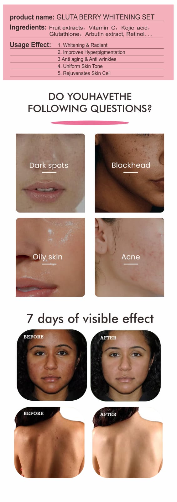 Glutathione: Known for its skin-lightening properties, helps reduce hyperpigmentation and promote a more even complexion.