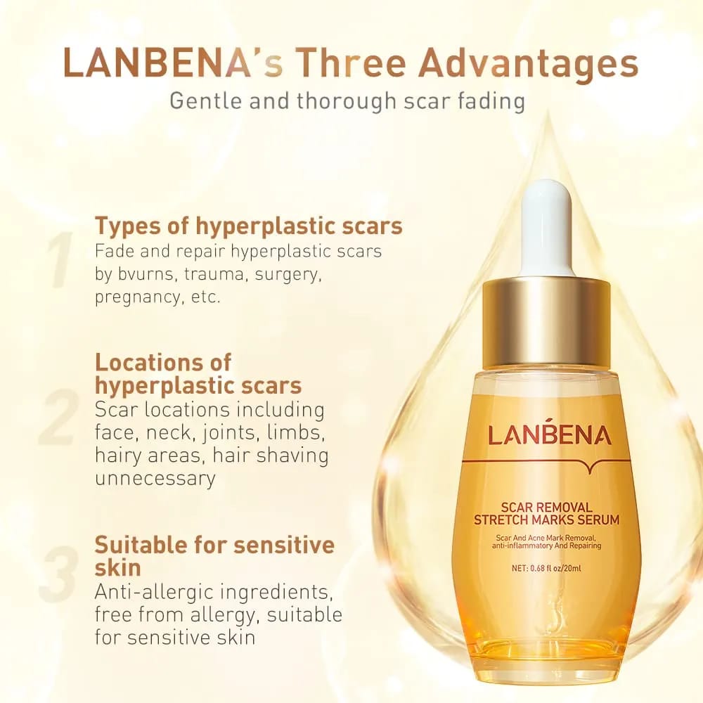- LANBENA Scar Removal Stretch Marks Serum is a potent skincare treatment designed to help reduce the appearance of scars, wrinkles, burns, wounds, and acne scars. This serum is formulated with natural herbal extracts to promote skin healing, improve texture, and enhance the overall appearance of the skin. It is suitable for all skin types and can be used on various areas of the body, including the face, legs, arms, and other problem areas.