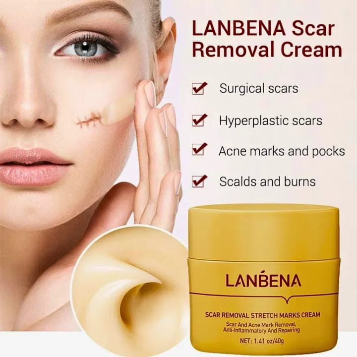 Lanbena Scar Remover Cream is a specialized skincare product designed to help fade the appearance of old scars, acne marks, stretch marks, and other types of skin imperfections. This cream works to promote skin repair and rejuvenation, leaving the skin smoother, clearer, and more even-toned.