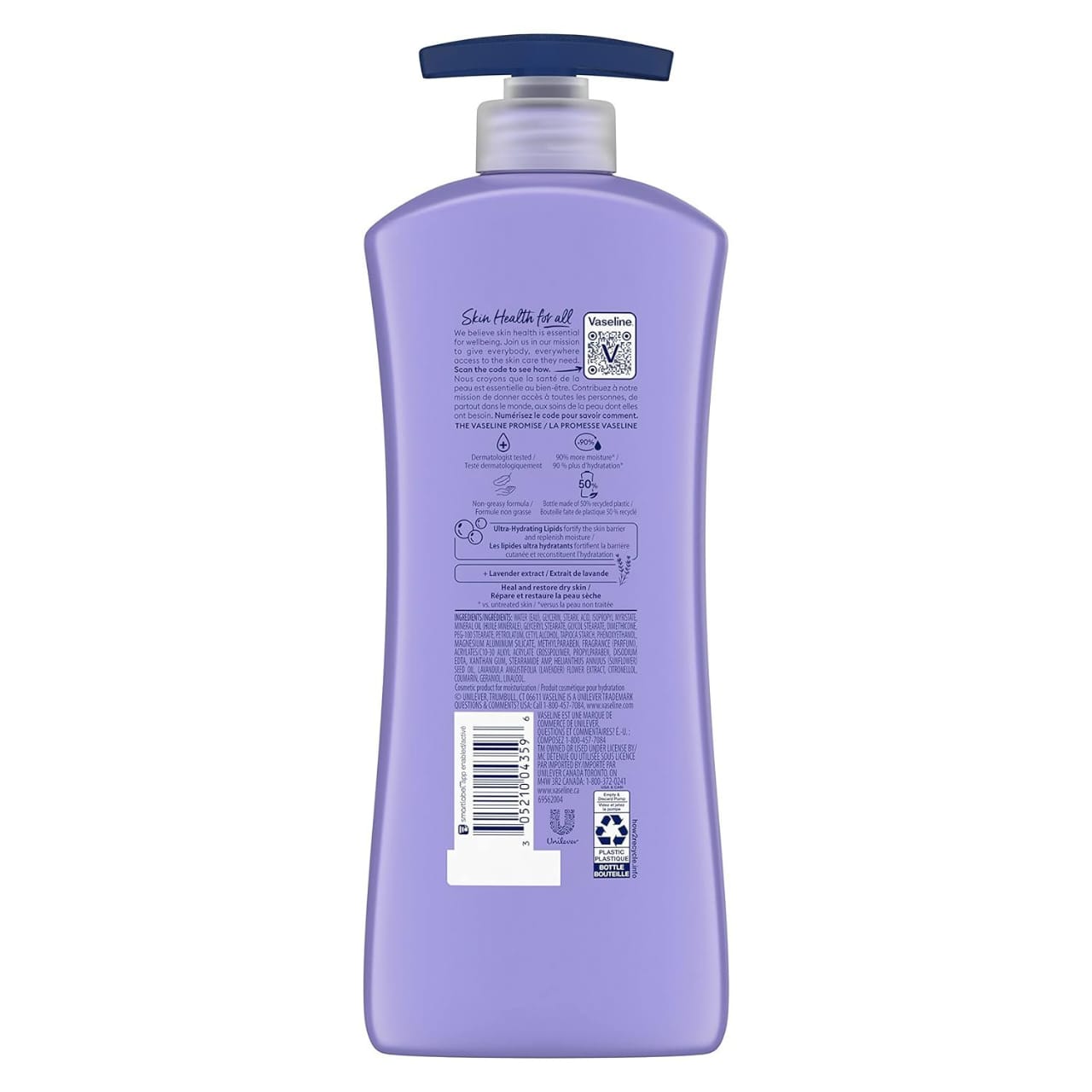 Vaseline Intensive Care Calm Healing Lotion calms, soothes and restores dry skin with a light lavender scent. This body lotion, formulated with Lavender Extract, helps keep your skin looking healthy and hydrated. With daily exposure to environmental triggers (like wind, lack of humidity, and sun), skin’s natural moisture barrier can break down, allowing water to escape the skin. The Ultra-Hydrating lipids in our lotion for dry skin fortify the skin barrier and replenish moisture to allow the skin’s natural barrier to recover. This lotion locks in moisture and promotes smooth, naturally glowing skin. The body moisturizer is clinically tested to provide 90% more moisture (vs. untreated skin). This body lotion for dry skin absorbs fast for rich moisturization and provides moisture all day long. Use this dermatologist-tested body lotion for dry skin daily on dry, rough skin for stronger, noticeably healthier skin. Just apply to your skin for hydrating relief. This Vaseline lotion bottle is made of 50% recycled plastic. Our ambition is to get to 100% recycled plastic in the near future. Since 2018, we’ve used 337 Metric Tons of recycled plastic across the Vaseline product portfolio in North America.
