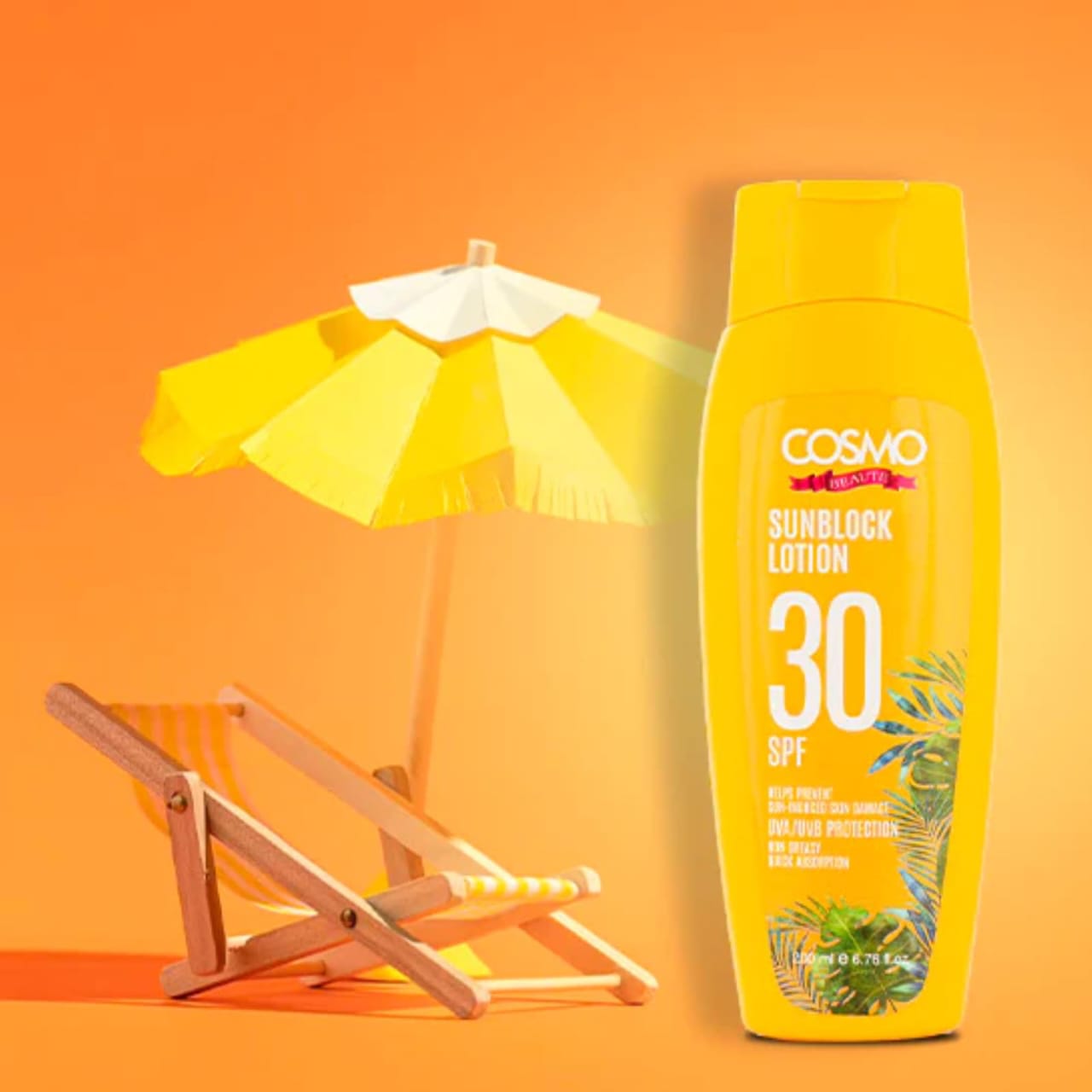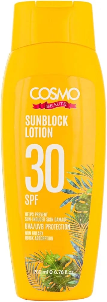 The COSMO DESIGNS Cosmo Beaute Sun Block Lotion SPF 30 is a high-performance sunscreen designed to offer broad-spectrum protection against harmful UV rays, ideal for daily use to protect your skin from sun-induced damage. This lotion is formulated to be non-greasy, making it comfortable for all skin types, and is suitable for both men and women. It comes in a 200ml bottle, providing long-lasting sun protection.